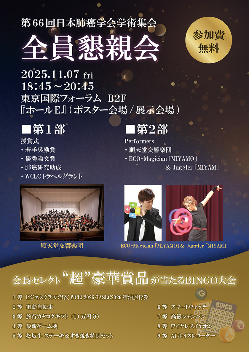 第66回日本肺癌学会学術集会では、全員懇親会を下記のとおり開催いたします。