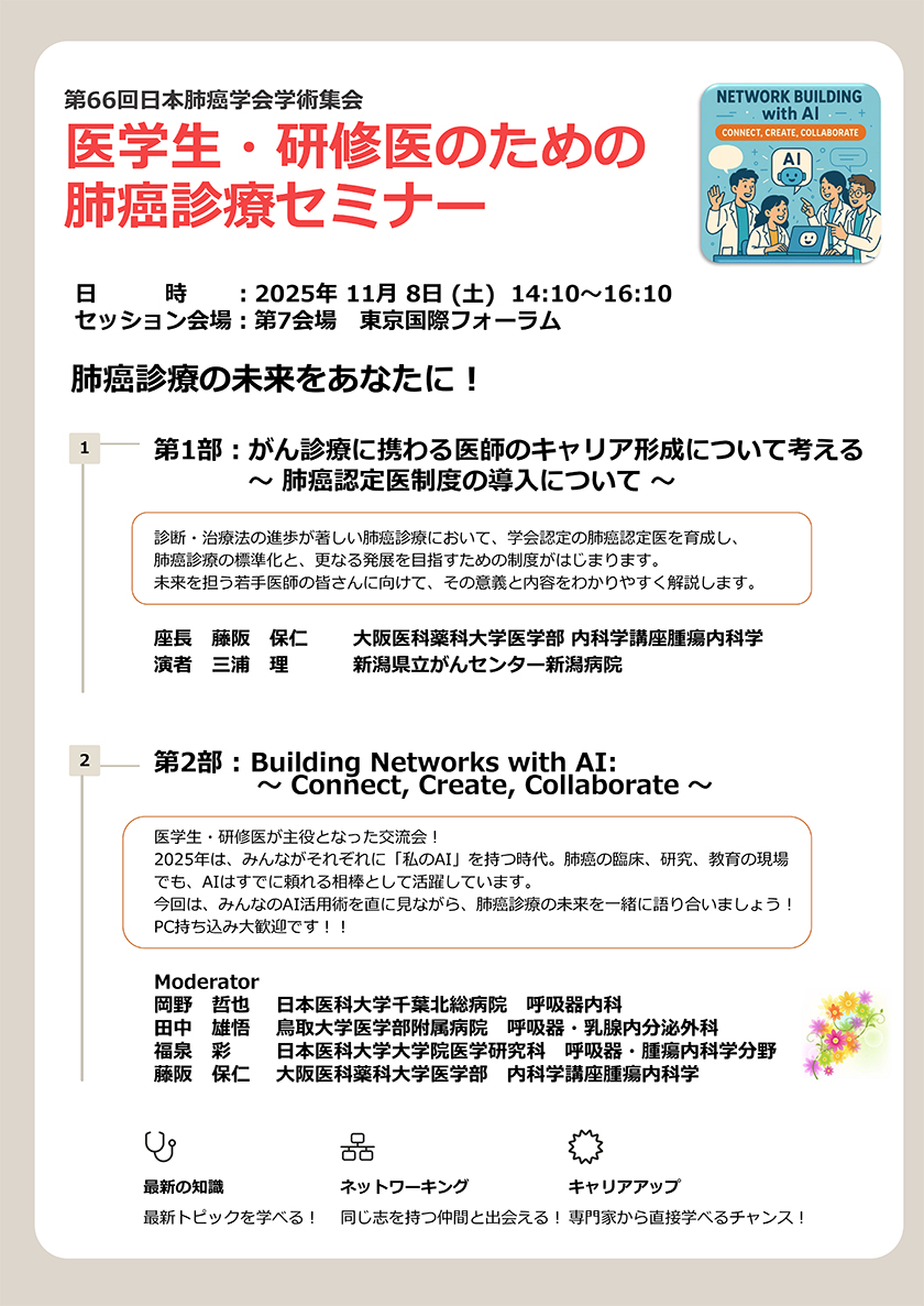 日本肺癌学会会員委員会では、来る第66回日本肺癌学会学術集会に於いて昨年に引き続き医学生、研修医向けの肺癌診療セミナー“肺癌診療の未来をあなたに!”を開催する運びとなりました。